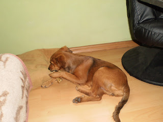 Nadeszła moja- czyli Dagmary kolej napisania czegoś konkretnego, dotyczącego naszego nowego domownika. Od kiedy pod nasz dach trafiła Zołza zdążyła już wściubić nosa w każdy kąt mieszkania (łącznie z łazienką do której pragnie wchodzić razem z nami) oraz spać w każdym z pokoi. Oprócz tego łazi za domownikami krok w krok łasząc się przez większość czasu. Gdy ma dosyć pieszczot chowa się za kanapą (miejsce dla nas raczej niedostępne) i radośnie merda ogonem uderzając w gipsową ścianę. Jest to dźwięk, który towarzyszy nam codziennie o czwartej nad ranem, kiedy Zołza się już wysypia i z radością zaczyna biegać po pokoju, jeść, czy właśnie wchodzić za łóżko z jednej strony i wychodzić z drugiej (długo tak potrafi).